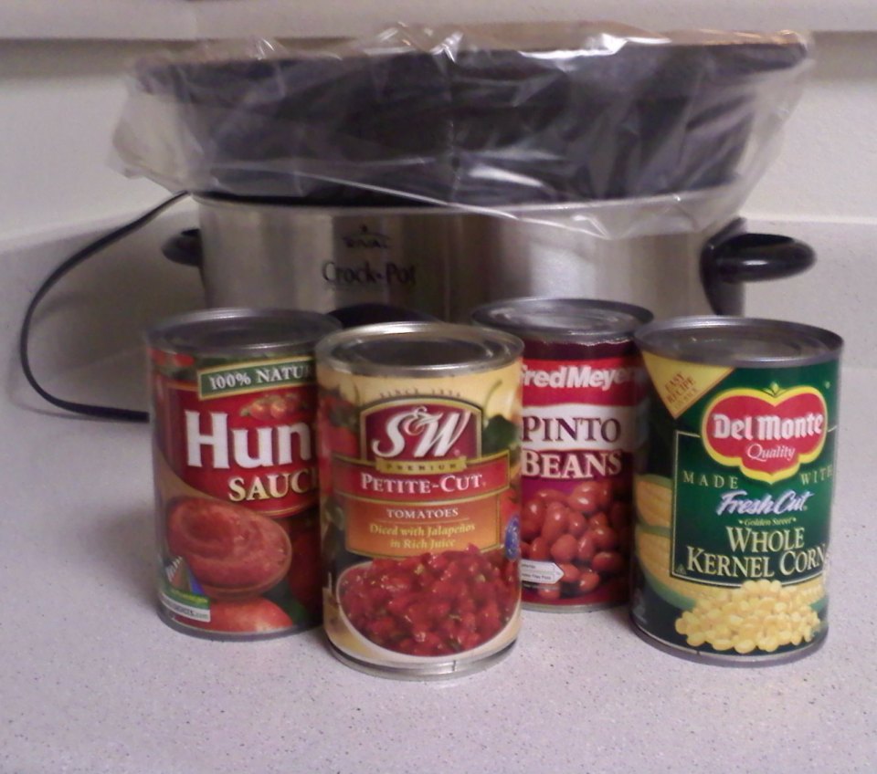 Tomato Sauce, Petite Cut Stewed Tomatos, Pinto Beans, Corn