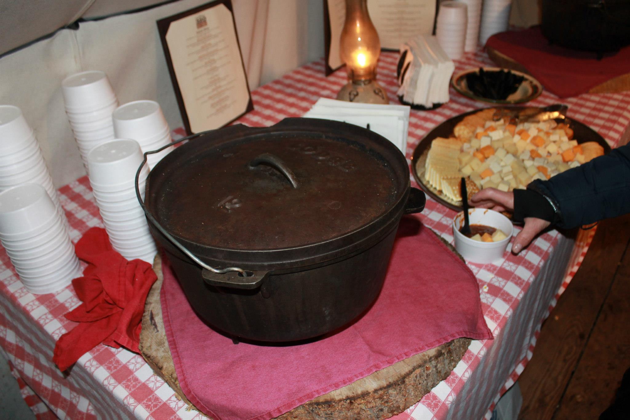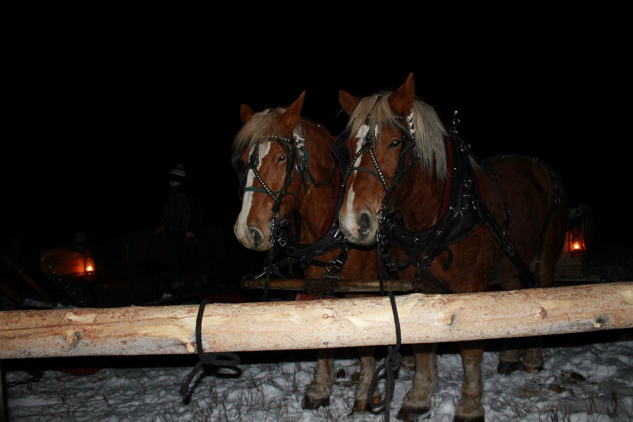 We arrived the ranch early so we dropped into the saloon for a few drinks until the sleigh was ready to go. When we got word that it was time, we found a pair of matching Percheron horses hitched up to an old wooden sleigh. We all climbed in and crawled under blankets before we traveled into the dark. When we got to the campsite we found a roaring fire outside, a warm pot of chili inside and hot alpines in the back.